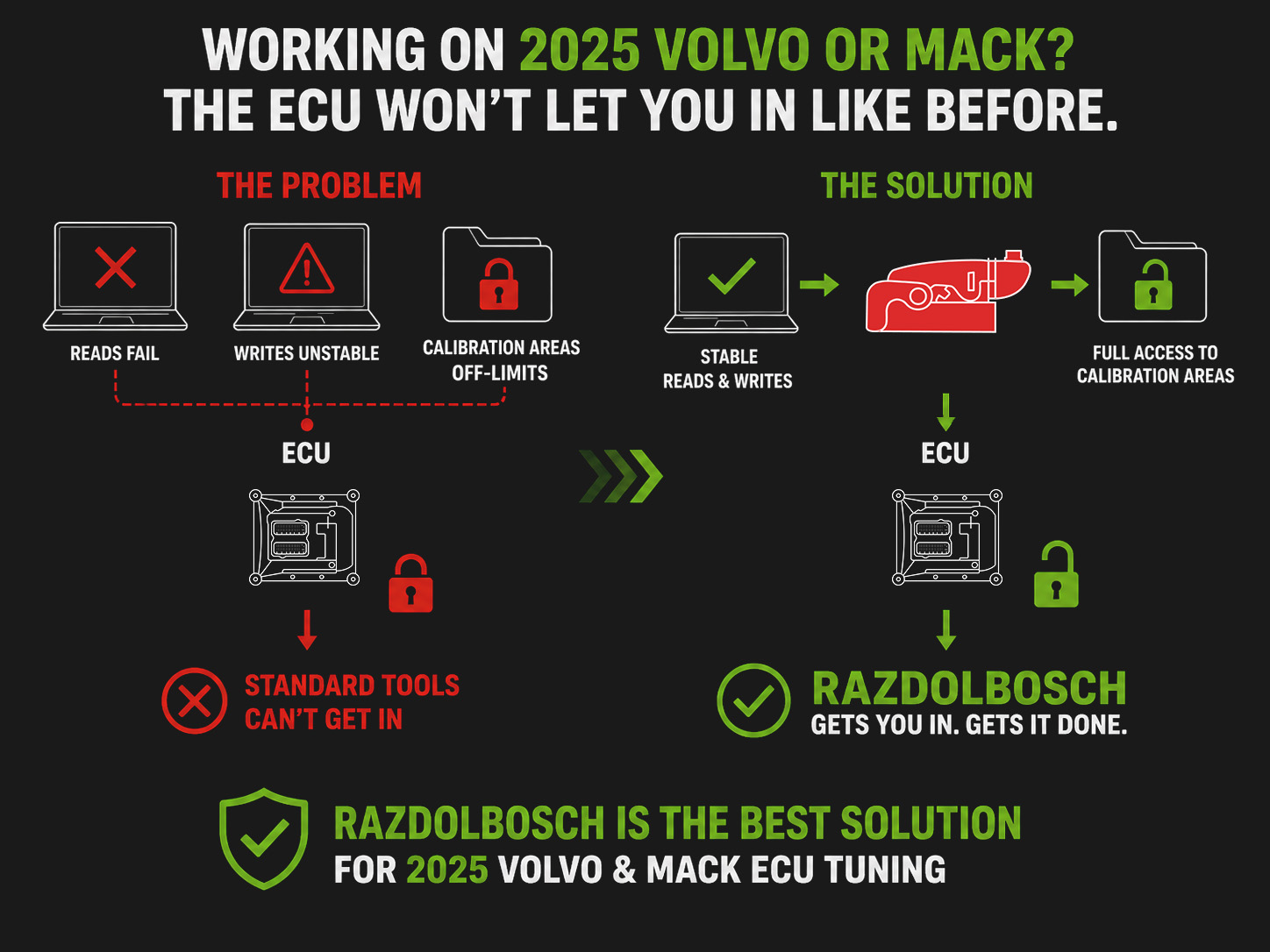 If you’ve tried working on a 2025 Volvo or Mack, you’ve probably run into the same wall — the ECU just won’t let you in the way it used to. Reads fail, writes get unstable, and some calibration areas are completely off-limits. At that point, even a solid setup stops being enough, and you start realizing you’re missing a proper truck ECU tuning tool for these newer systems.