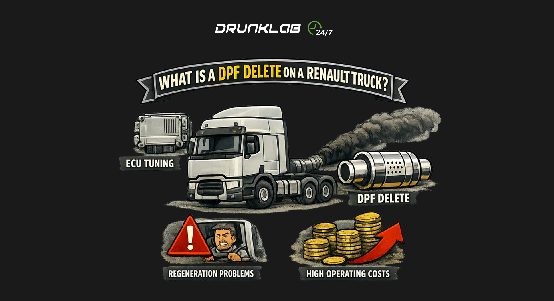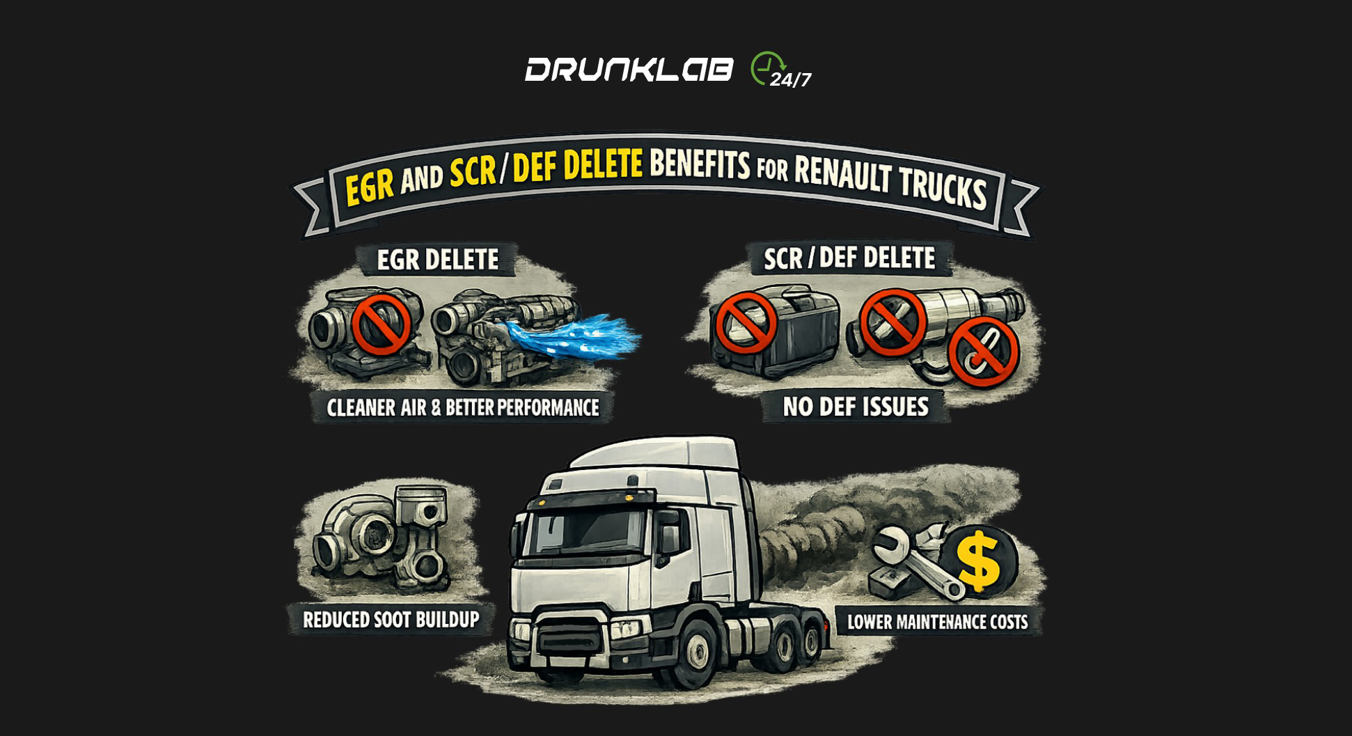 DrunkLab provides software-based emissions delete, ECU programming, and custom performance tuning for all major Renault truck engines.