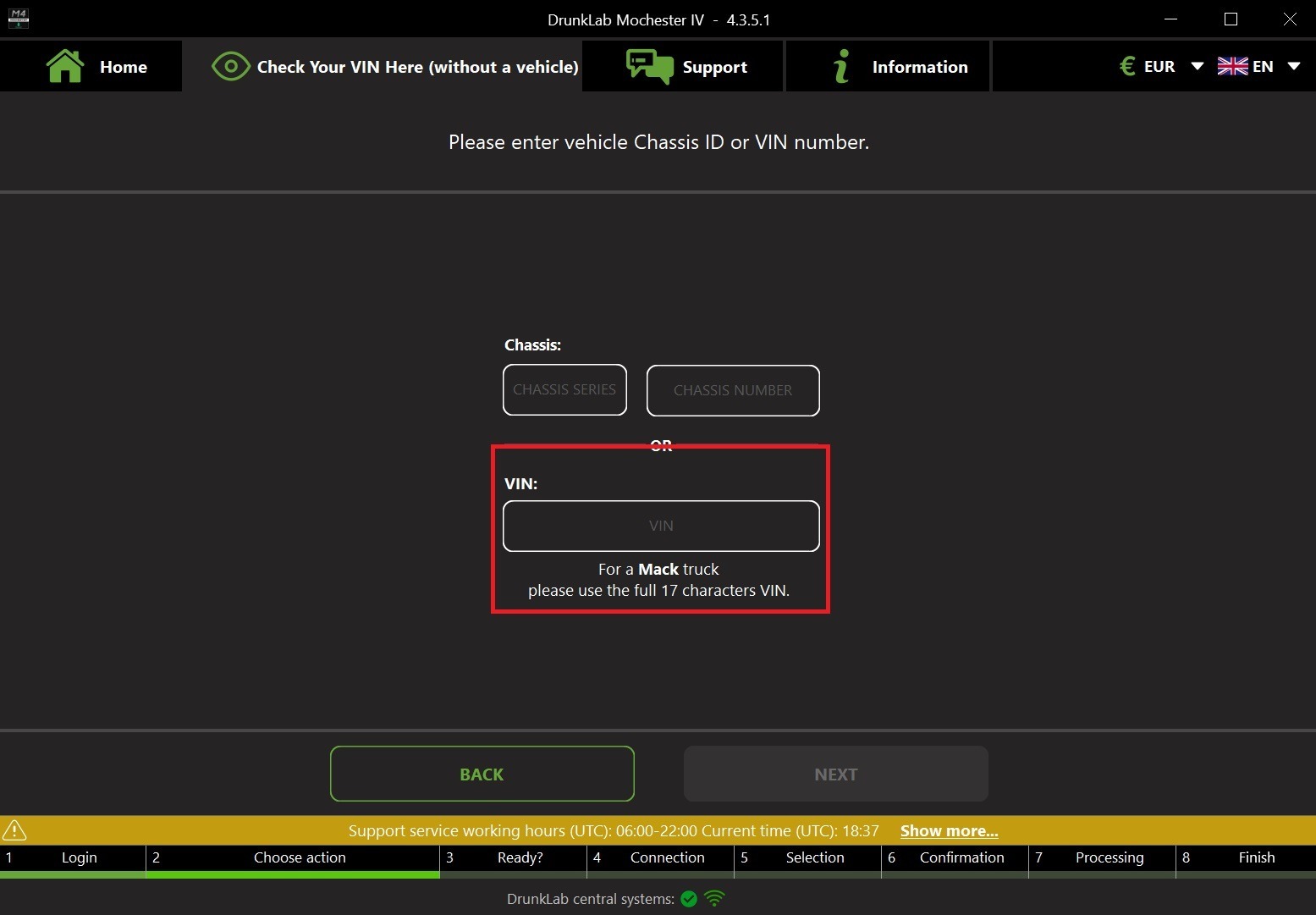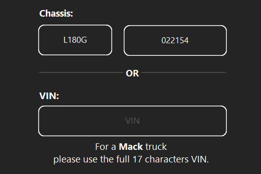 Let’s return to the previous screen and use the Chassis Series + ID identification. This identification is used for Volvo Construction Equipment and is usually referred to as PIN (Product Identification Number).