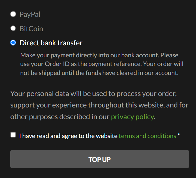 With this option, you must go to your bank of choice or email them with the payment details and Order ID as a reference. It may take the bank several days to clear your payment and only then your account with DrunkLab will be credited.